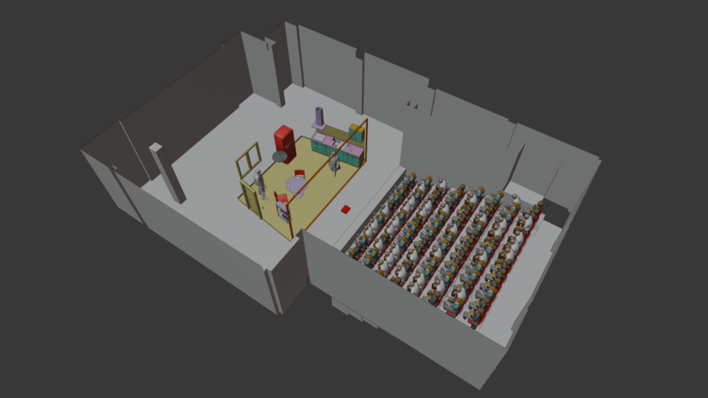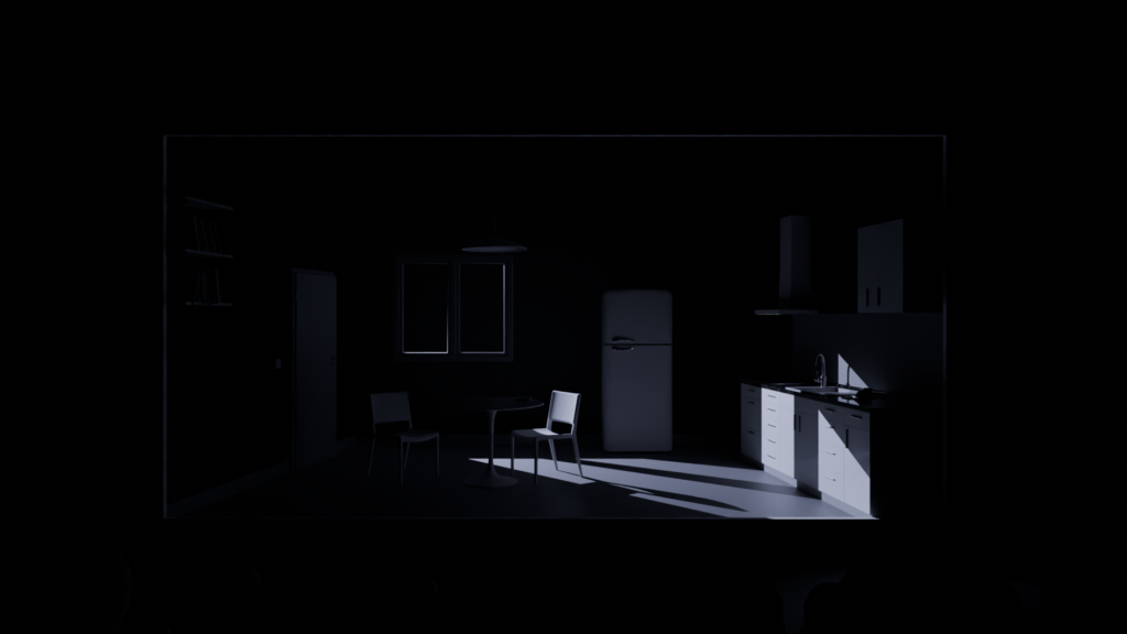 Comme pour tous les travaux de scénographie que nous réalisons, la prévisualisation 3D est un outil central de la phase de développement. Cela permet de s’assurer que les éléments soient adaptés à chaque salle, de communiquer facilement avec l’équipe et de pouvoir élaborer un budget de fabrication réaliste. Concernant VIDEO-CLUB, elle s’est avérée très utile pour caler les images projetées sur le tulle holographique